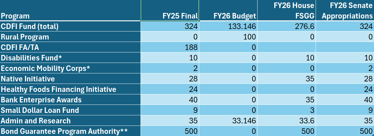 Appropriations levels for the CDFI Fund are summarized in the chart below: