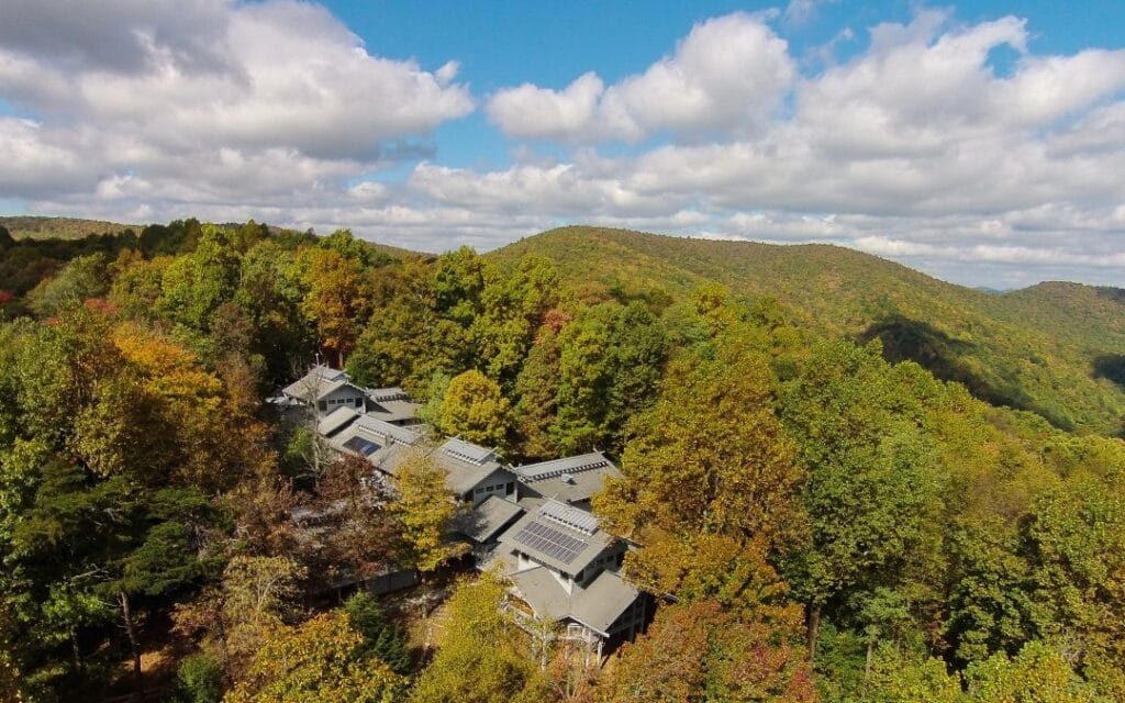 The unusual Inn, located just outside Dawsonville, is reachable only by a moderate five-mile hike from the top of Amicalola Falls through the Chattahoochee National Forest.