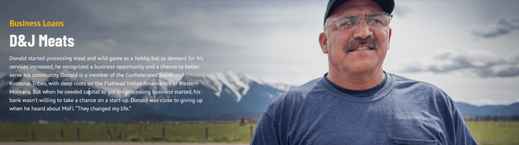 Donald started processing meat and wild game as a hobby, but as demand for his services increased, he recognized a business opportunity and a chance to better serve his community. Donald is a member of the Confederated Salish and Kootenai Tribes, with deep roots on the Flathead Indian Reservation of Western Montana. But when he needed capital to get his processing business started, his bank wasn’t willing to take a chance on a start-up. Donald was close to giving up when he heard about MoFi. “They changed my life.”